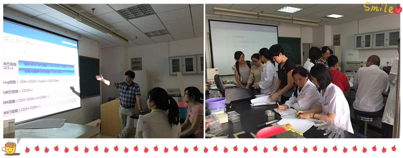 流式上機(jī)培訓(xùn)上午8點(diǎn)半開(kāi)始,首先由華中科技大學(xué)同濟(jì)醫(yī)學(xué)院免疫系梁智輝老師為大家詳細(xì)介紹了本次實(shí)驗(yàn)的相關(guān)內(nèi)容,包括:檢測(cè)人外周血中的T/B/NK/NKT/Treg的marker的選擇、panel設(shè)置、對(duì)照選擇/設(shè)置,protocol染色操作及注意事項(xiàng),流式操作標(biāo)準(zhǔn)化之抗體稀釋等。
