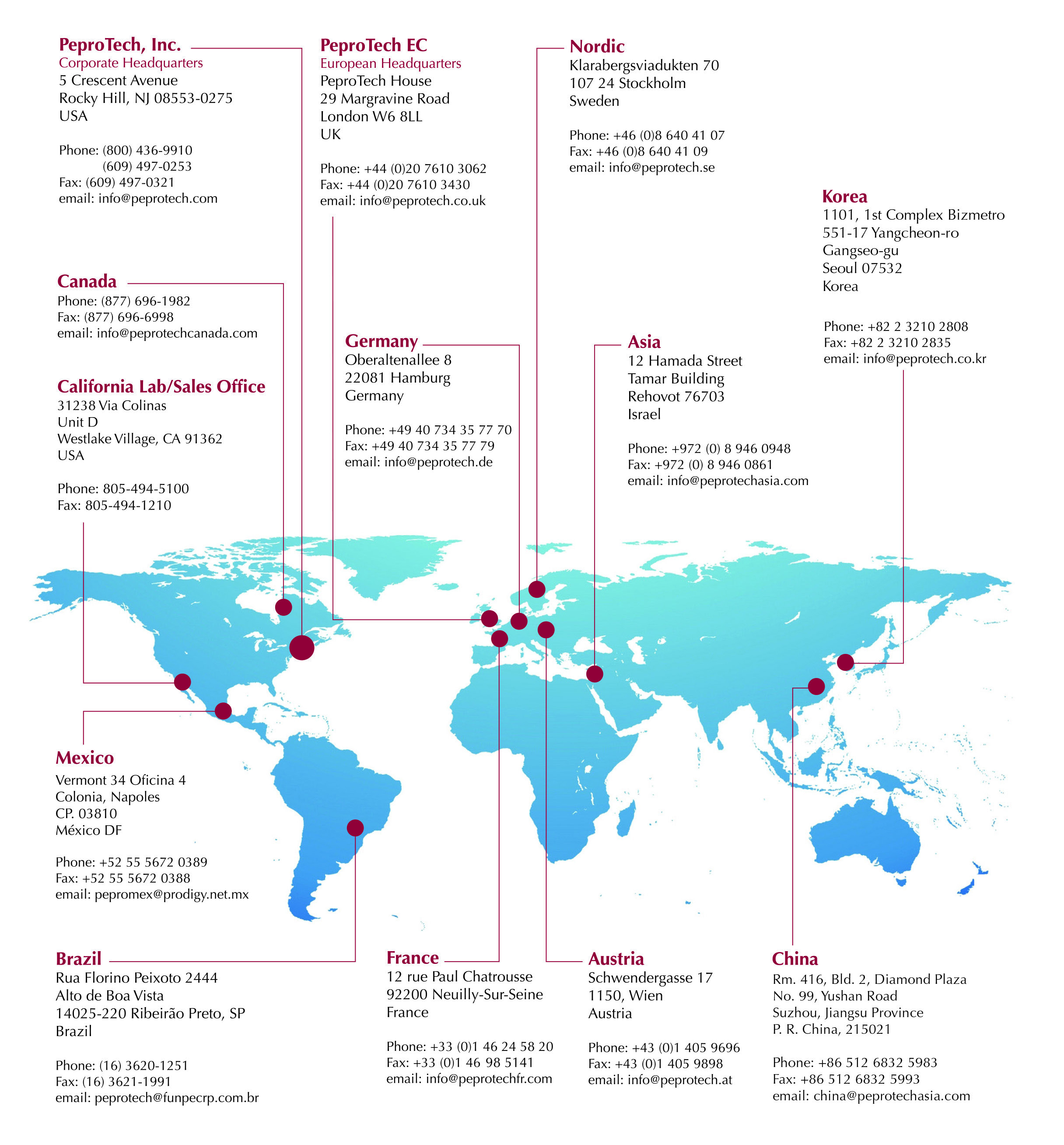 PeproTech 公司創(chuàng)立于1988年,總部位于美國(guó)新澤西州。 PeproTech 公司始 終致力于為生命科學(xué)研究和細(xì)胞治療市場(chǎng)提供高品質(zhì)的細(xì)胞因子產(chǎn)品。在過 去的27年 里,PeproTech在推動(dòng)這些領(lǐng)域的發(fā)展中一直扮演著重要角色。美 國(guó)總部的先進(jìn)生產(chǎn)設(shè)施和遍布十余個(gè)國(guó)家的客戶服務(wù)網(wǎng)絡(luò),使得PeproTech 公司成為科研工作者可以信賴的合作伙伴。同時(shí),來自科研院所和工業(yè)界的 研究人員為我們產(chǎn)品線的不斷擴(kuò)充提供了寶貴的意見和創(chuàng)意源泉。PeproTech 公司運(yùn)用創(chuàng)新方法開發(fā)出 2000 余種高品質(zhì)、高穩(wěn)定性和重復(fù)性的 產(chǎn)品,包括大腸桿菌、昆蟲細(xì)胞和哺乳動(dòng)物細(xì)胞來源的重組細(xì)胞因子/蛋白 、相關(guān)單克隆/多克隆抗體、ELISA試劑盒、無血清細(xì)胞培養(yǎng)基以及其他細(xì)胞 因子相關(guān)試劑。欲了解 PeproTech 全套產(chǎn)品線、獲取產(chǎn)品詳情和參考文獻(xiàn)等,請(qǐng)?jiān)L問其官網(wǎng):www.peprotech.com。