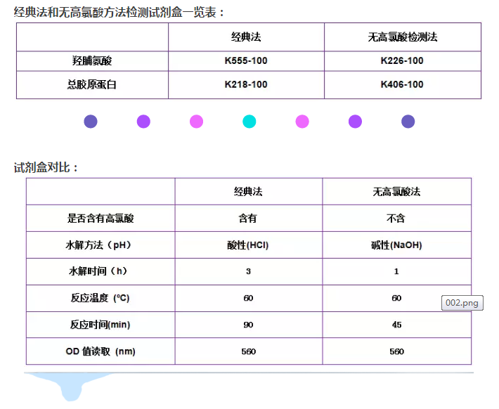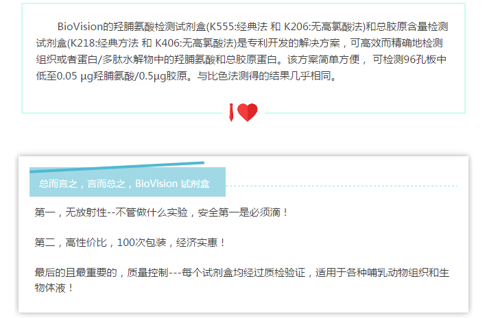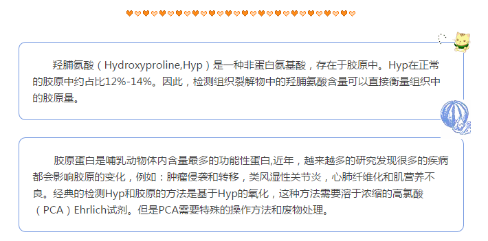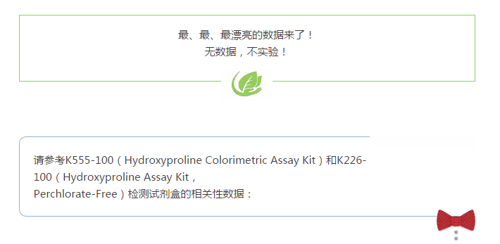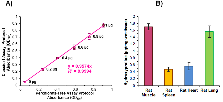 Figure (A). 經(jīng)典高氯酸法檢測(cè)的試劑盒(k555-100)和無(wú)高氯酸法檢測(cè)試劑盒(k266-100)的標(biāo)準(zhǔn)曲線之間的相關(guān)性比較。數(shù)據(jù)顯示此兩種檢測(cè)方法具有非常好的相關(guān)性(R2 > 0.999)。 (B). K266-100試劑盒檢測(cè)大鼠樣本中的總羥脯氨酸的含量。
