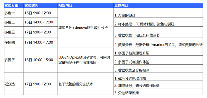 *注:請注意多色一、二、三、四為同一實驗,請根據(jù)自己的時間報名,請勿重復(fù)報名。上機實訓(xùn)多色實驗擬招40人,多因子實驗與磁分選實驗分別擬招10人。