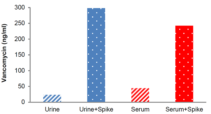 加標回收實驗: 人血清和尿液樣本加300ng/ml的萬古霉素,回收率為80-100%。