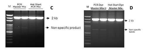 *使用Hot-Start Master Mix(含熱啟動酶)的實(shí)驗(yàn)組PCR產(chǎn)物特異性較高