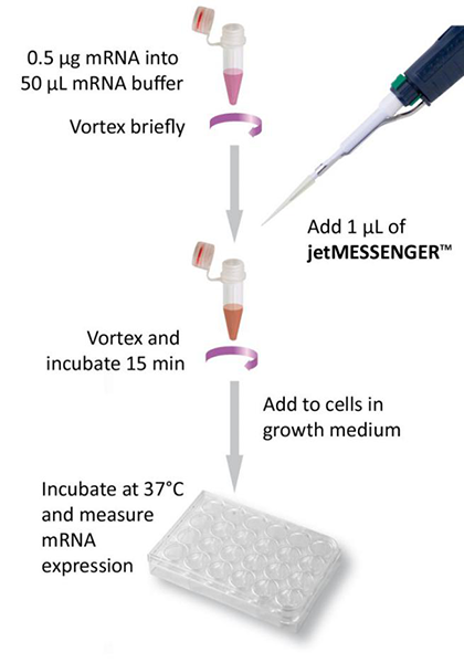 mRNA轉(zhuǎn)染是針對(duì)難轉(zhuǎn)染細(xì)胞如神經(jīng)元、原代細(xì)胞和懸浮細(xì)胞(淋巴細(xì)胞)的一種新的解決方法。這種轉(zhuǎn)染方法相較于DNA轉(zhuǎn)染有很多優(yōu)點(diǎn):更高的轉(zhuǎn)染效率、轉(zhuǎn)染后更快速的蛋白表達(dá)以及較低的基因插入突變風(fēng)險(xiǎn)。mRNA瞬時(shí)轉(zhuǎn)染可用于很多用途,包括細(xì)胞重編輯,基因編輯(CRISPR/Cas9)及疫苗研發(fā)。Polyplus-transfection?公司研發(fā)了一款新型的mRNA轉(zhuǎn)染試劑jetMESSENGERTM,難轉(zhuǎn)染細(xì)胞現(xiàn)在很容易轉(zhuǎn)染!