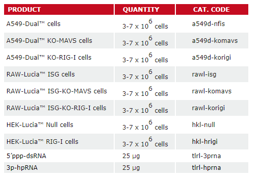 InvivoGen提供一系基于人源肺癌細(xì)胞株A549,小鼠巨噬細(xì)胞RAW和人源胚腎細(xì)胞HEK293穩(wěn)轉(zhuǎn)細(xì)胞系,助力RNA感受器RIG-I信號(hào)通路的研究。這些細(xì)胞系包括RIG-I或MAVS基因的敲除細(xì)胞株(衍生自A549或RAW細(xì)胞系)或者RIG-I基因的過(guò)表達(dá)細(xì)胞株(衍生自HEK-293細(xì)胞系)。