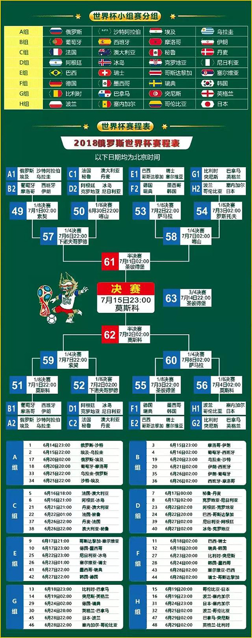 2018俄羅斯世界杯即將到來,這是世界人民的大party,無論您是忠實(shí)球迷還是偽球迷,您都會(huì)感受到世界杯帶來的熱情、純粹、肆意。我們可以把工作、煩惱拋于腦后,觀賞頂級(jí)足球賽事,茶余飯后和大家有聊不完的話題,或在酷熱的天喝啤酒。各位大俠,請(qǐng)收下這份2018世界杯賽程表,今年大力神杯會(huì)留在歐洲還是南美,讓我們拭目以待~