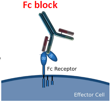 因此,在流式實驗過程中,除非檢測細(xì)胞中Fc受體的表達(dá),通常我們會使用純化的抗體來進(jìn)行Fc受體的封閉,如圖: