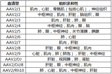 目前發(fā)現的AAV有AAV1~AAV11、DJ等12種不同的血清型,主要區(qū)別在于衣殼蛋白Cap的不同,并決定不同血清型AAV對不同的組織和細胞有不同的感染效率。