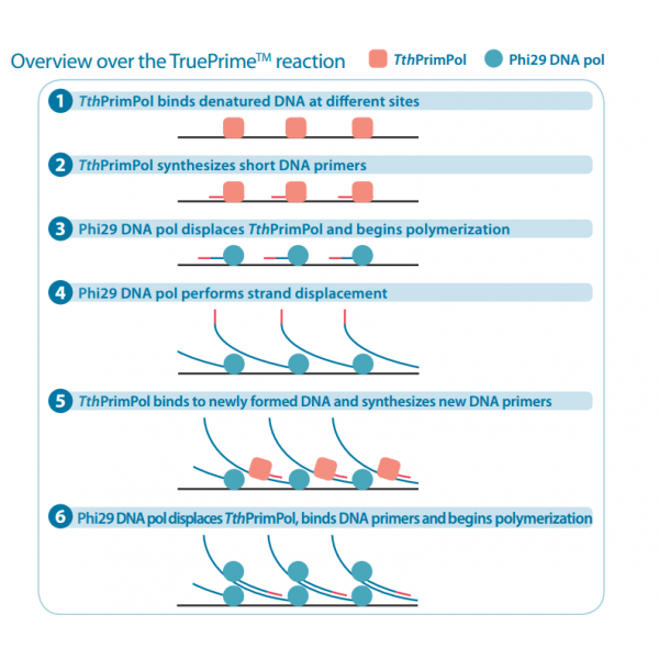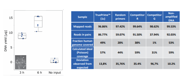TruePrime?采用MDA技術(shù),基于新型的TthPrimPol 引物酶和Phi29 DNA聚合酶,擴(kuò)增過(guò)程無(wú)需添加隨機(jī)引物,減少了擴(kuò)增偏倚,提高了擴(kuò)增過(guò)程的覆蓋率和保真性,并且對(duì)于污染的外源DNA不敏感,可重復(fù)性好。TruePrime?可用于單個(gè)細(xì)胞或少量細(xì)胞的全基因組擴(kuò)增,與常見(jiàn)的NGS平臺(tái)如Illumina和IonTorrent等兼容性良好。
