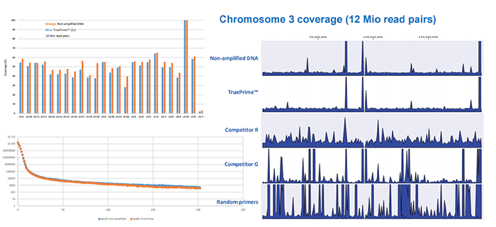 右圖:3號(hào)染色體圖譜的覆蓋模型,TruePrime?擴(kuò)增得到的DNA與未擴(kuò)增的DNA覆蓋率接近。