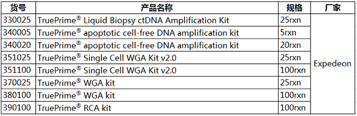 擴(kuò)增能力強(qiáng),無(wú)引物互作,無(wú)擴(kuò)增偏倚,覆蓋率高,保真性好,重復(fù)性好,集諸多優(yōu)勢(shì)于一身的TruePrime?,還有什么理由不選擇呢?TruePrime?會(huì)為您的單細(xì)胞測(cè)序工作帶來(lái)極大的便利!除此之外,Expedeon還提供用于擴(kuò)增cfDNA, circular DNA等多種類(lèi)型DNA的試劑盒喲!
