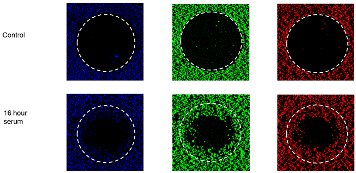 細(xì)胞排斥區(qū)分析(間隙封閉法)是Platypus公司獲得專利的技術(shù)。讓細(xì)胞在孔的底部圍繞一個(gè)阻止細(xì)胞生長(zhǎng)的區(qū)域(如在孔底部中央放置阻塞物)生長(zhǎng),實(shí)驗(yàn)在移除阻塞物后開(kāi)始,可觀察單層細(xì)胞遷移到原先的空白區(qū)域中。