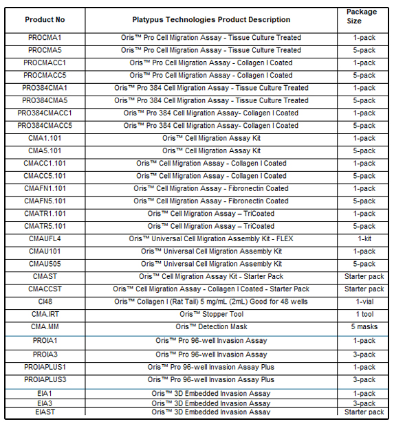 美國(guó)Platypus Technologies公司建立于2000年,是細(xì)胞分析領(lǐng)域產(chǎn)品的耗材供應(yīng)商,熱賣產(chǎn)品為OrisTM和OrisTM Pro系列細(xì)胞遷移和侵襲實(shí)驗(yàn)試劑盒。其開(kāi)發(fā)的用于檢測(cè)細(xì)胞遷移和侵襲的細(xì)胞排斥區(qū)分析法,克服了Transwell和劃痕實(shí)驗(yàn)的缺點(diǎn)。