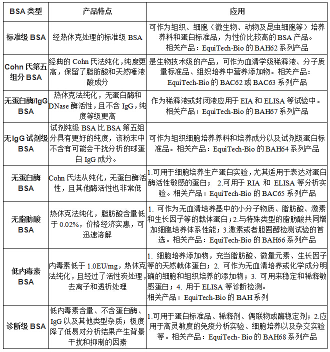 牛血清白蛋白Albumin from bovine serum,BSA,又稱為組分V或Cohn V,名稱起源于BSA的分餾法——Cohn 冷乙醇法, Cohn 冷乙醇法是由哈佛大學(xué)Edwin Cohn教授于1946年發(fā)明的。當(dāng)時(shí)基于戰(zhàn)爭創(chuàng)傷治療對注射級別蛋白的大規(guī)模需求,Cohn教授在較低的溫度下改變血漿的乙醇濃度和pH值,使其所含蛋白在不同乙醇濃度下析出,在第五個(gè)析出的組分中主要成分為BSA,所以BSA又稱組分V或Cohn V。Cohn法仍然是目前非常普遍的BSA分餾法。 美國大的生物原材料供應(yīng)商Equitech-Bio提供經(jīng)典冷乙醇法和先進(jìn)的熱休克法純化的高質(zhì)量、分類齊全的BSA,助力您的實(shí)驗(yàn)!