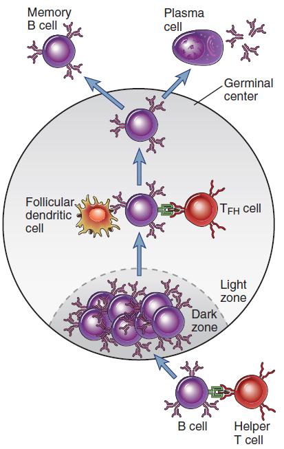 Tfh 細(xì)胞的主要作用是增加高親和力 B 細(xì)胞和長壽漿細(xì)胞的形成,并幫助他們轉(zhuǎn)移到發(fā)生中心(GC)。在接受抗原刺激后,初始 B 細(xì)胞首次移動到 T 細(xì)胞區(qū),且在來自 Tfh 細(xì)胞和抗原呈遞細(xì)胞的共刺激作用下開始活化并形成發(fā)生中心。當(dāng)發(fā)生中心的 B 細(xì)胞開始分化為漿細(xì)胞或記憶 B 細(xì)胞時, Bcl-6 會阻止 B 細(xì)胞的增殖,因?yàn)?Bcl-6 可以抑制 B 細(xì)胞活化基因的表達(dá),如 CD69、 STAT1 和 CD80 等,同時也會通過調(diào)節(jié) Prdm1 來抑制發(fā)生中心的 B 細(xì)胞向漿細(xì)胞分化。 Tfh 細(xì)胞通過 CD40 的作用致使 Bcl-6 轉(zhuǎn)錄沉默,從而促使發(fā)生中心 B 細(xì)胞存活和增殖。且在這一過程中,CD40L、PD-1、BAFF、IL-4 和 IL-21 等信號分子的參與也是必不可缺的。