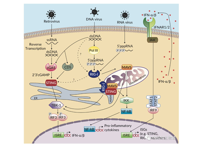 感受器cGAS和RIG-I通過(guò)單獨(dú)的接頭蛋白來(lái)識(shí)別不同的核酸和信號(hào)。cGAS感受細(xì)胞質(zhì)中異常DNA的存在和濃度,而后通過(guò)環(huán)二核苷酸2’3’-cGAMP[2]募集干擾素基因刺激因子(STING, or MITA/ERIS/MPYS)。RIG-I檢測(cè)出5`-二/三磷酸末端未加帽的病毒RNA和短平末端雙鏈部分的病毒RNA后,其與線粒體抗病毒信號(hào)蛋白(MAVS, or IPS-1/VISA/Cardif)[1]結(jié)合。它們激活后,cGAS/STING和RIG-I/MAVS將觸發(fā)共同的信號(hào)級(jí)聯(lián)反應(yīng)導(dǎo)致I型干擾素(IFNs)和促炎性因子的產(chǎn)生。